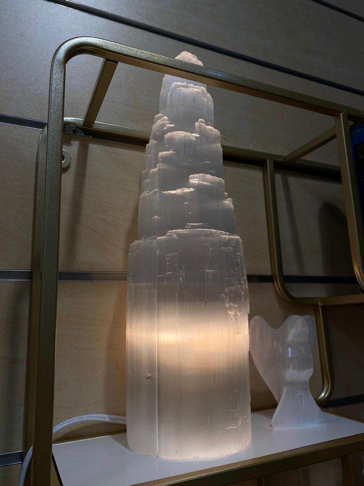 Natural Selenite Mountain Lamp White Crystal Tower Handmade Lamp Spiritual Healing Cleanse and Recharge Crystals Table Lamp Decoration Gift
